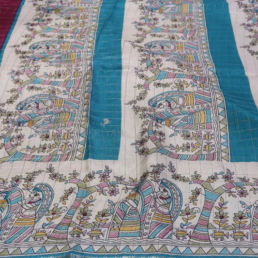 DOLA SILK SAREE WITH KALAMKARI PRINTS - Maroon/Blue
