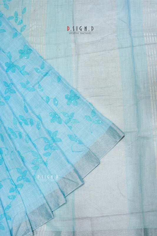 ICE BLUE SEQUIN FLORAL LINEN COTON SAREE