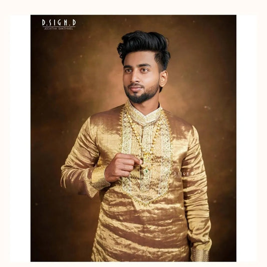 Regular price From ₹18,000.00 INRRegular priceUnit price / perSale price From ₹18,000.00 INRGold Embroidered Muhurtham Silk Shirt