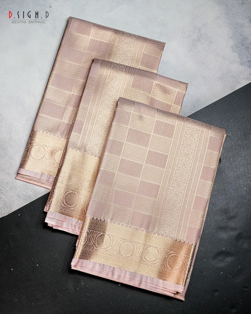 Elevate your special moments with the Bridal Rose Tissue Kattam Fine-Silk Dhoti Set, crafted from premium fine silk with a luxurious tissue finish. The soft bridal rose shade adds a romantic charm, beautifully enhanced by the timeless pattu kattam (checked weave) and ornate zari borders. Its gentle sheen and fluid drape make it the perfect ensemble for weddings, engagement ceremonies, and festive occasions. Thoughtfully woven for grooms and families who prefer elegance with a modern touch, this set blends heritage artistry with contemporary sophistication.