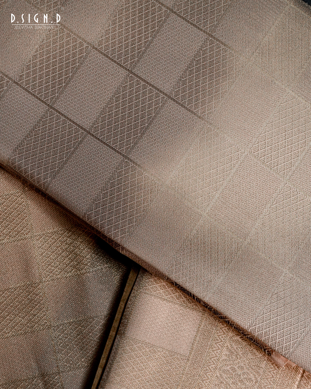 Indulge in refined luxury with the Rose Gold Tissue Kattam Fine-Silk Dhoti Set, meticulously woven from premium fine silk with a radiant tissue finish. The elegant rose gold hue adds a contemporary charm while the classic pattu kattam (checked weave) and rich zari borders elevate the ensemble with traditional grandeur. Its soft, fluid drape and delicate shimmer make it an exquisite choice for weddings, receptions, temple ceremonies, and festive occasions—perfect for grooms and families who appreciate understated opulence.